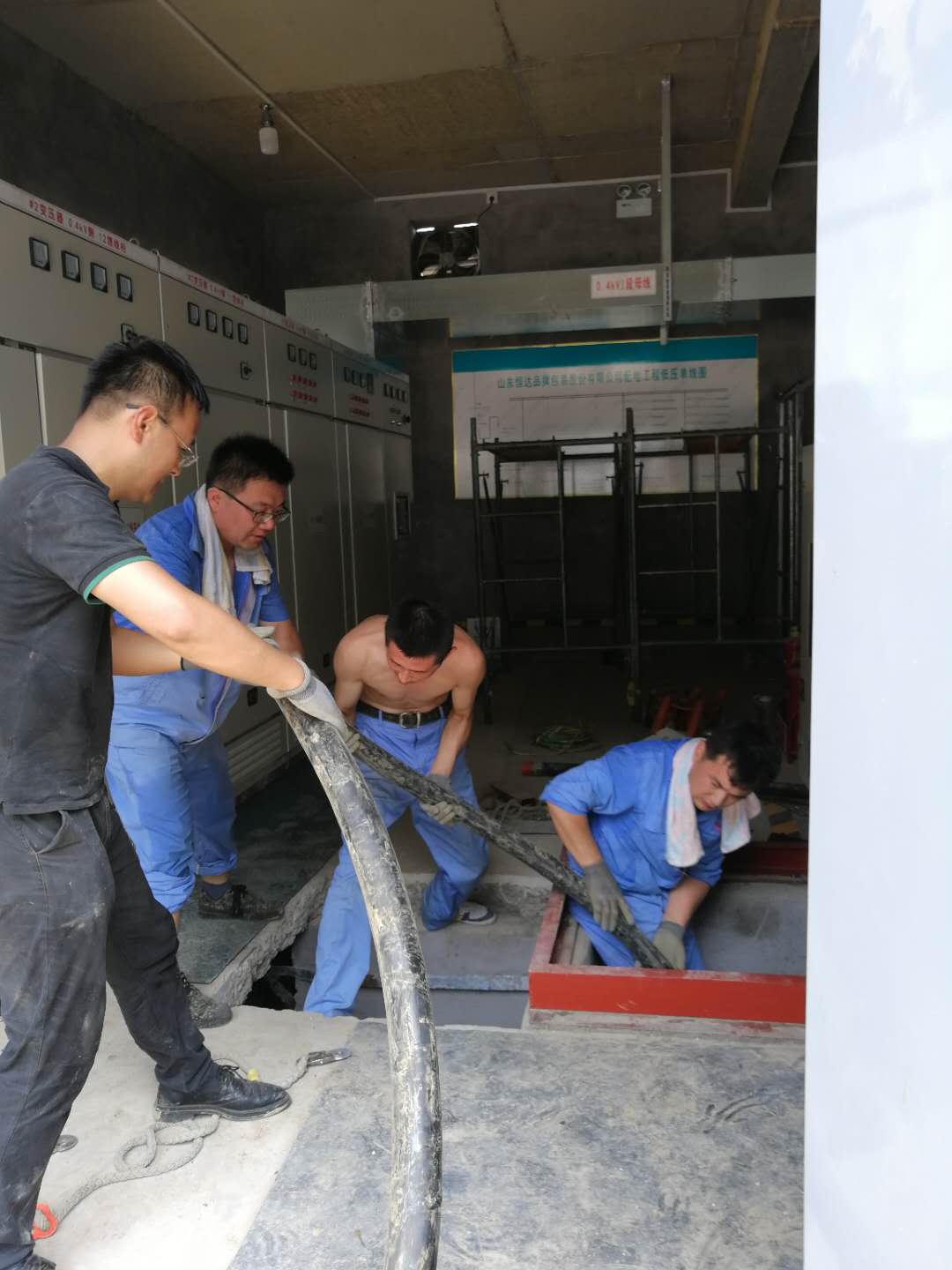 早上7:00,同志們按時自覺地趕到公司大門口報到,迅速地換好工作服、拿好安全帽、毛巾、水杯,統(tǒng)一乘車前往工地。項目經(jīng)理簡單作了安排,一組負責配電室,二組負責拉線纜,三組負責線桿斷送電。分工之后,各就各位,立馬投入工作。配電室現(xiàn)場,一二車間的同志在狹小的空間,挪柜子,穿線纜,默默無聞,悄無聲息地干著;放線現(xiàn)場,一二、一二的喊號聲,此起彼伏,行管和司機班的同志拉著手臂粗的高壓線,行走在坑洼不平的樹叢中;線桿現(xiàn)場,項目部的同志如同猿猴般爬上爬下,操作嫻熟。項目經(jīng)理王明拖著受傷的手背,一會兒前,一會兒后,果斷指揮,巧妙調(diào)度;工會主席王慎印每到一處都要強調(diào)扎好安全帶,戴好安全帽,拉好警戒線,提醒、提示,一刻也不馬虎。同志們個個臉上掛滿了汗珠,一抹一摔都是水,衣服濕了干,干了濕。人人任勞任怨,衣服、鞋子都是泥水,手磨起了水泡,胳膊嗮起了皮。就是這樣,大家擰成一股繩,踏踏實實干事,在客戶要求的時間完成了任務,跑出了“國恒速度”,展現(xiàn)了“國恒精神”。