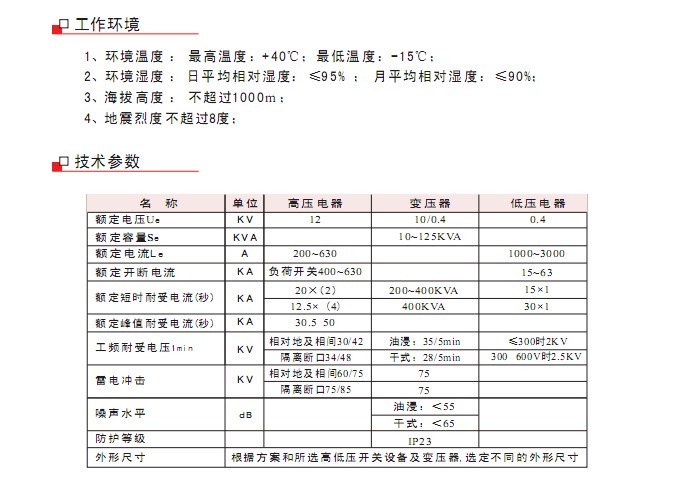 本產(chǎn)品由高壓配電裝置、變壓器及低壓配電裝置聯(lián)接而成,分成三個功能隔室,即高壓室、變壓器室和低壓室,高、低壓室功能齊全。高壓側(cè)一次供電系統(tǒng),可布置成環(huán)網(wǎng)供電、終端供電、雙電源供電等多種供電方式,還可裝設(shè)高壓計量單元,滿足高壓計量的要求。變壓器可選S11油浸式變壓器或SCB10干式變壓器;變壓器室設(shè)有自動強(qiáng)迫風(fēng)冷系統(tǒng),低壓室根據(jù)用戶所需供電方案,有動力配電、照明配電、無功功率補(bǔ)償、電能計量和電量測量等多種功能,滿足用戶的不同要求,并方便用戶的供電管理和提高供電質(zhì)量!